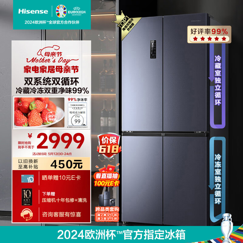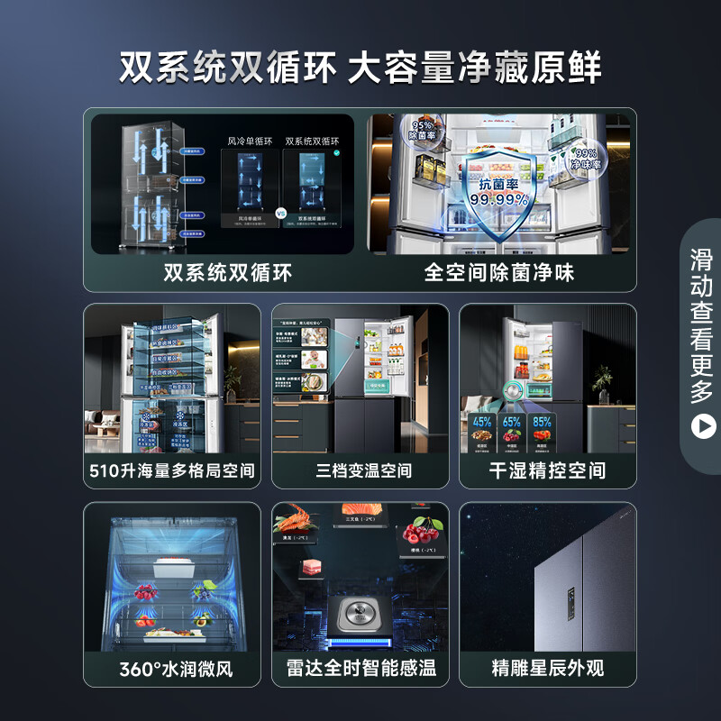 海信(Hisense)四开门冰箱一级能效家用电冰箱十字门510升全空间除菌无霜大容量BCD-510WMK1DPJ双系统双循环价格:3299.00元!