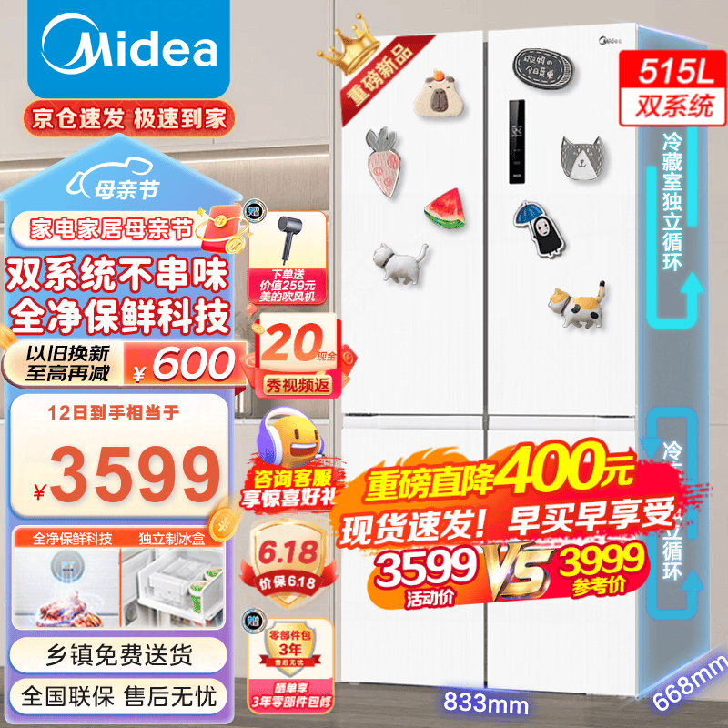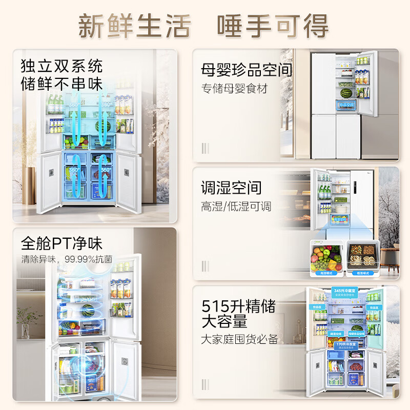 美的(Midea)540十字四开门对开门变频一级能效双系统双循环大容量净味风冷无霜独立制冰盒智能白色冰箱 MR-540WSPZE价格:3999.00元!