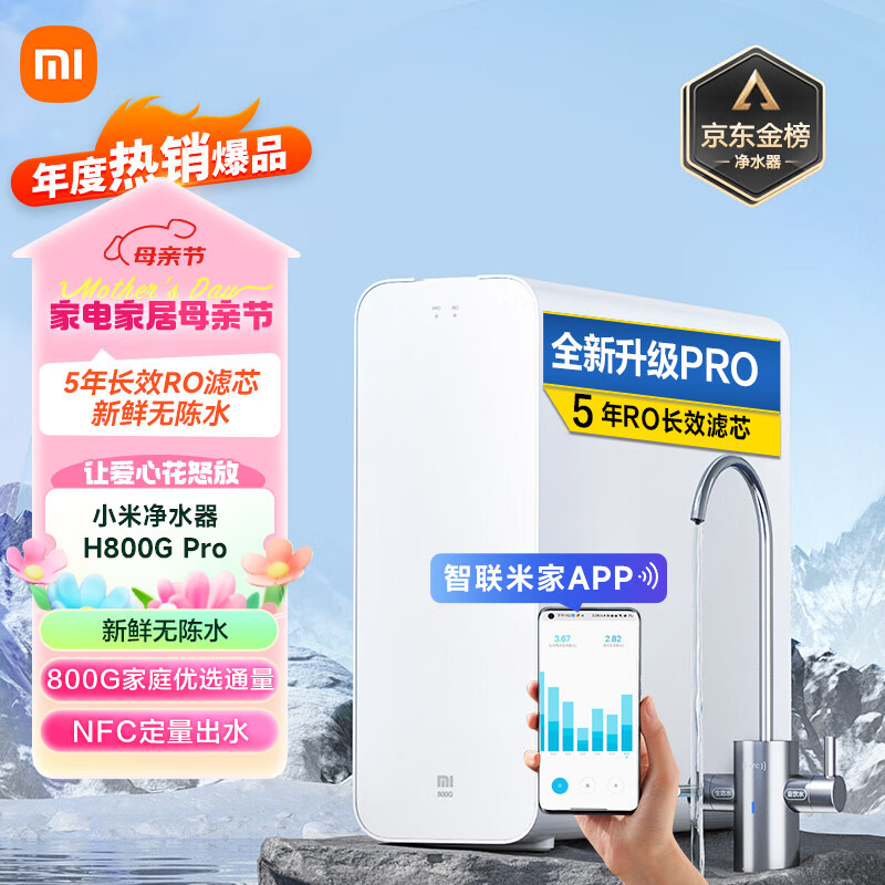 米家小米净水器家用净水机H800G Pro厨下式直饮机 六级过滤 5年RO反渗透 双出水龙头 无陈水 智能互联价格:1449.00元!