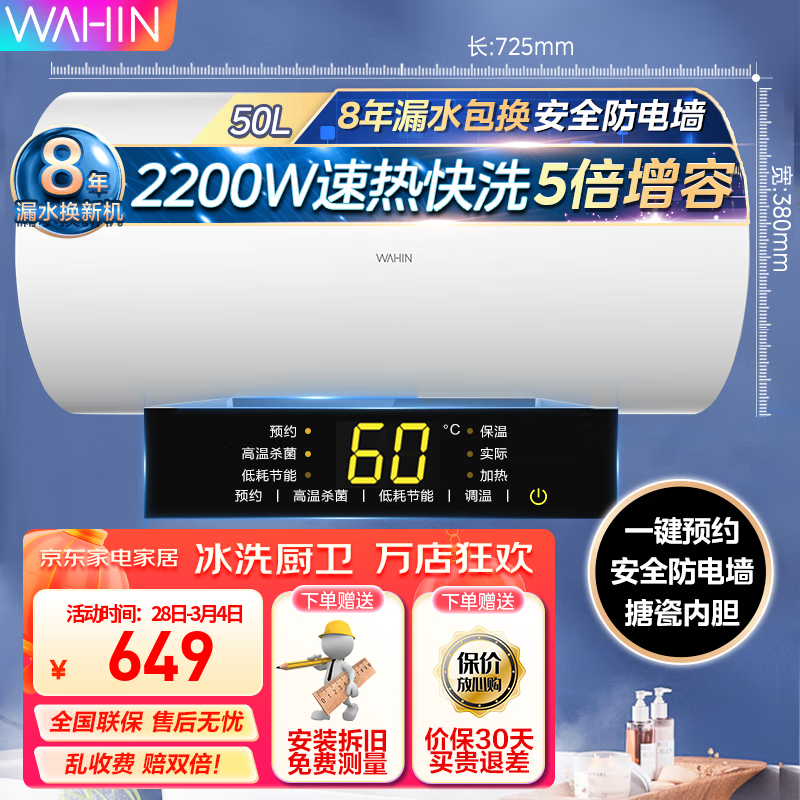 美的(Midea)出品储水式电热水器60升 自动断电 2200w速热智能家电 家用防电墙带预约功能控制50升热水器 【50升】五倍增容美的华凌YJ2价格:649.00元!