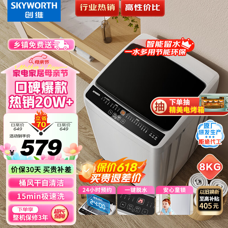 创维(SKYWORTH)8KG公斤大容量全自动波轮洗衣机家用 小型 超薄 租房神器 15分钟快洗 洁净桶风干T80F价格:579.00元!
