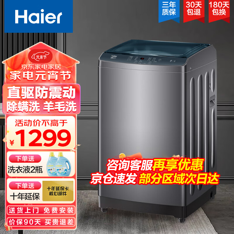 海尔(Haier)直驱变频全自动波轮洗衣机10公斤家用大容量一级能效超净洗羊毛除螨洗智能自编程BZ506[家电]价格:1499.00元!