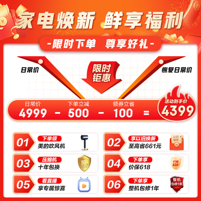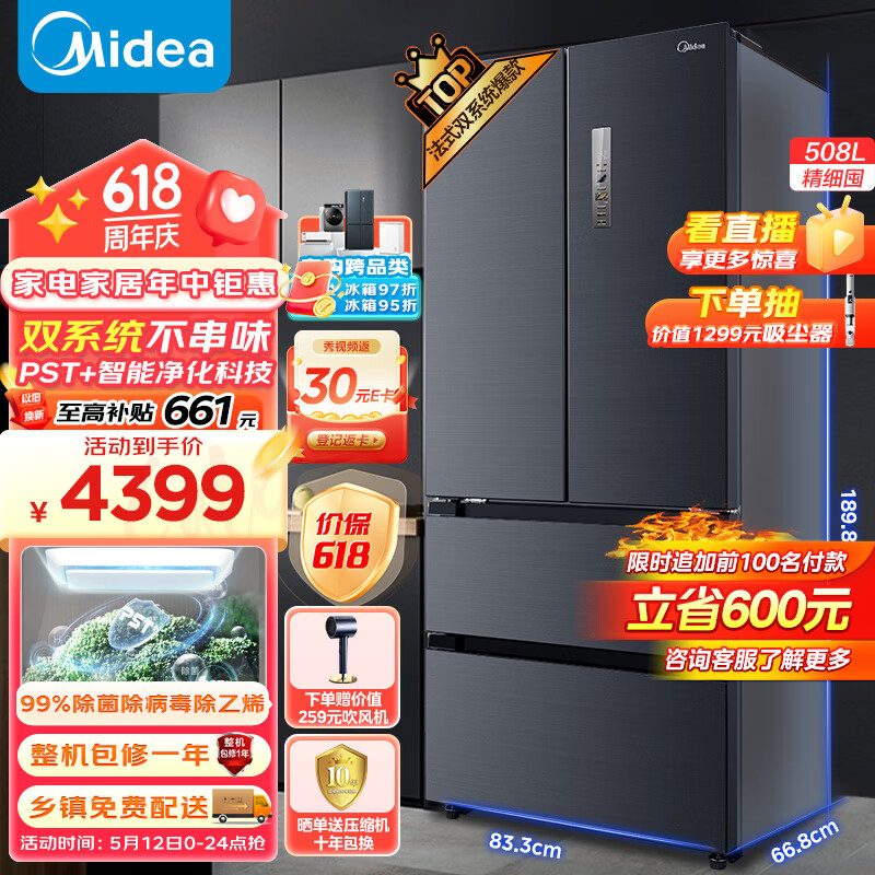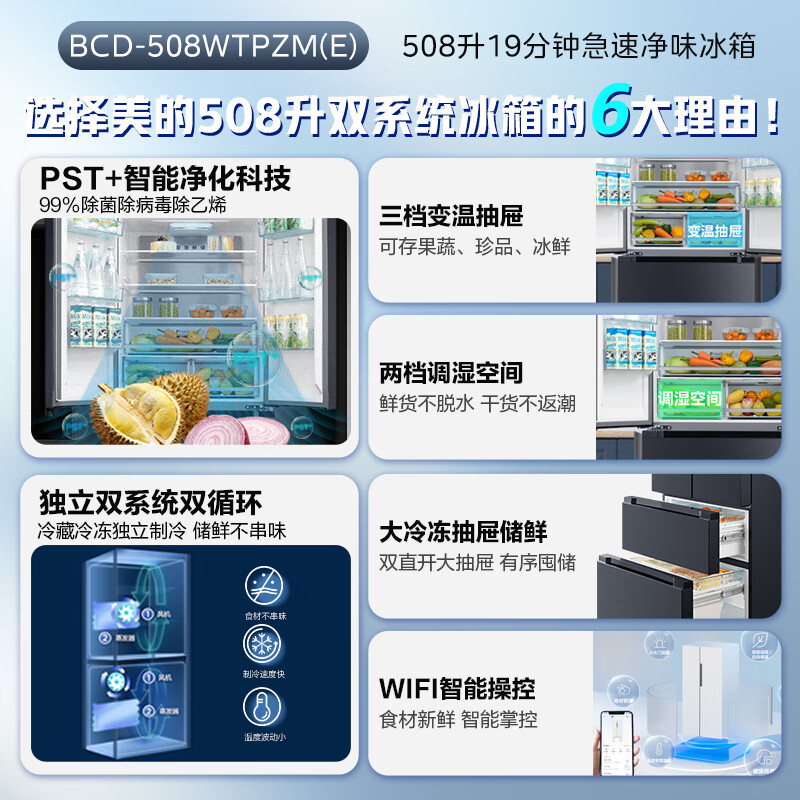 美的(Midea)19分钟急速净味508升变频一级能效法式四开门双系统双循环多门冰箱大容量BCD-508WTPZM(E)莫兰迪灰价格:4999.00元!