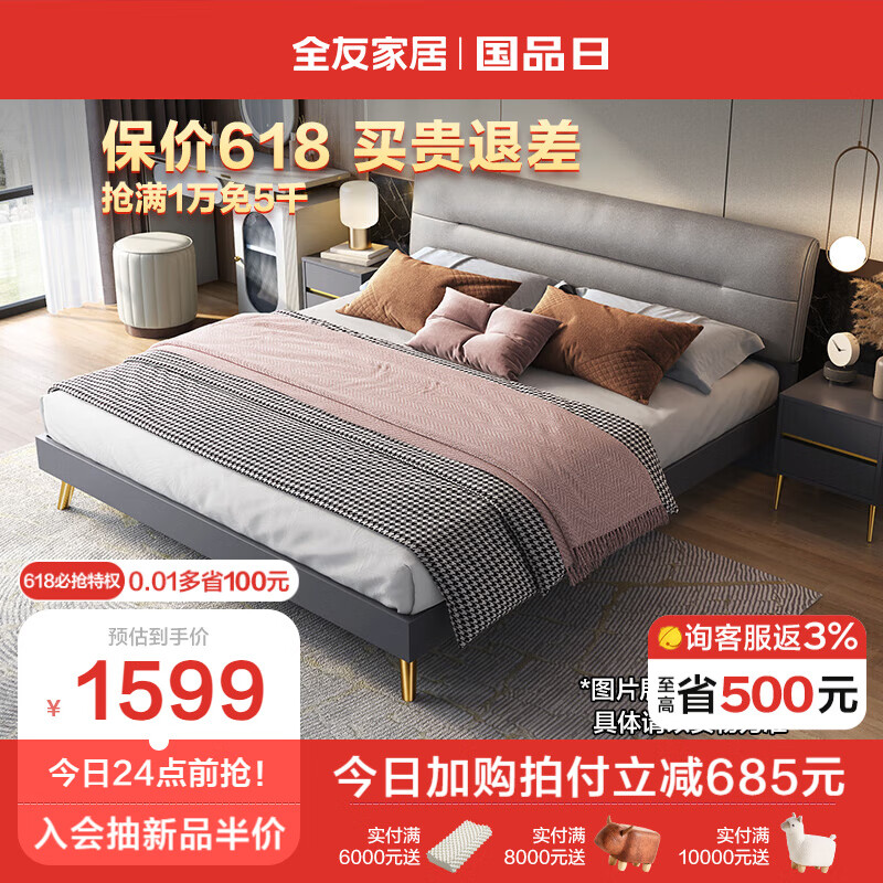 全友家居 主卧室轻奢科技布艺床板式床家用高脚双人床1.5x2米126805价格:2284.29元!