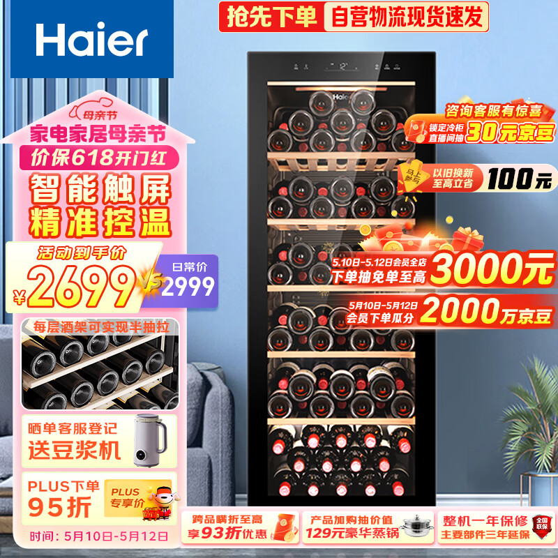 海尔(Haier)198升86瓶装家用恒温红酒柜 客厅办公室葡萄酒冷藏酒柜WS086A 以旧换新价格:2899.00元!