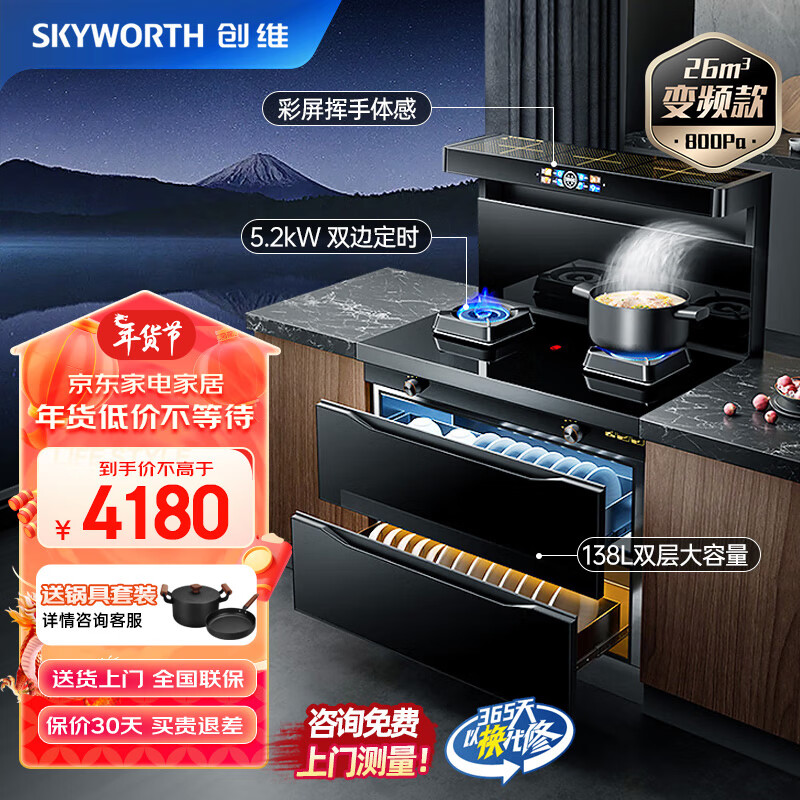 创维(Skyworth)集成灶一体灶 26大吸力变频节能 家用抽油烟机燃气灶 保洁柜烟灶套装天然气JJZT-J001B价格:4280.00元!