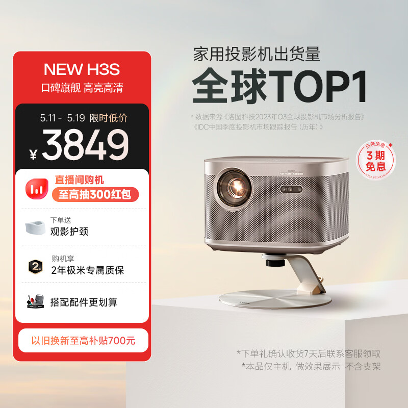 极米NEW H3S 投影仪家用 投影机 智能家庭影院(1500CVIA 哈曼专利音响 MT9669旗舰芯片 极米2年全保)价格:3849.00元!