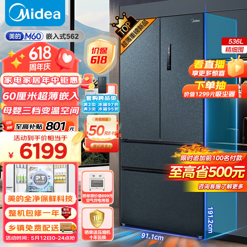 美的(Midea)M60系列562法式多门四开门超薄零嵌入式平嵌一级变频风冷无霜大容量家用电冰箱智能MR-562WUFPZE价格:7199.00元!