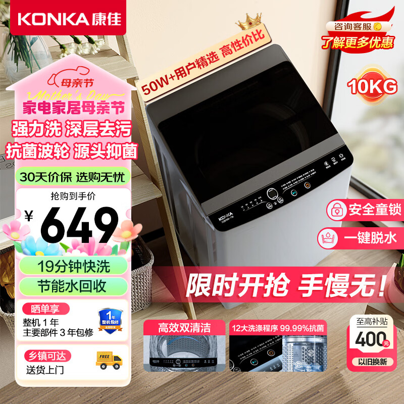 康佳10公斤全自动波轮洗衣机大容量 七重智控 一键脱水 家用租房 高效除菌 桶自洁桶风干XQB100-718价格:649.00元!
