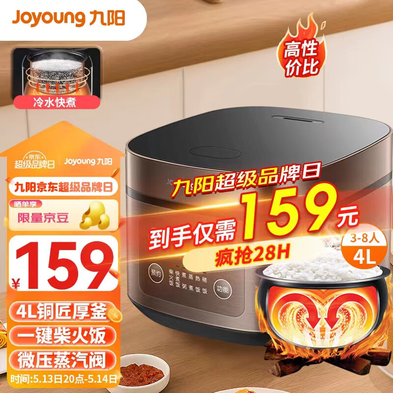 九阳(Joyoung)4升3~8人家用智能电饭煲电饭锅大火力柴火饭智能预约30分钟快煮饭多功能焖煮防溢4L方煲F-40FZ815价格:169.00元!