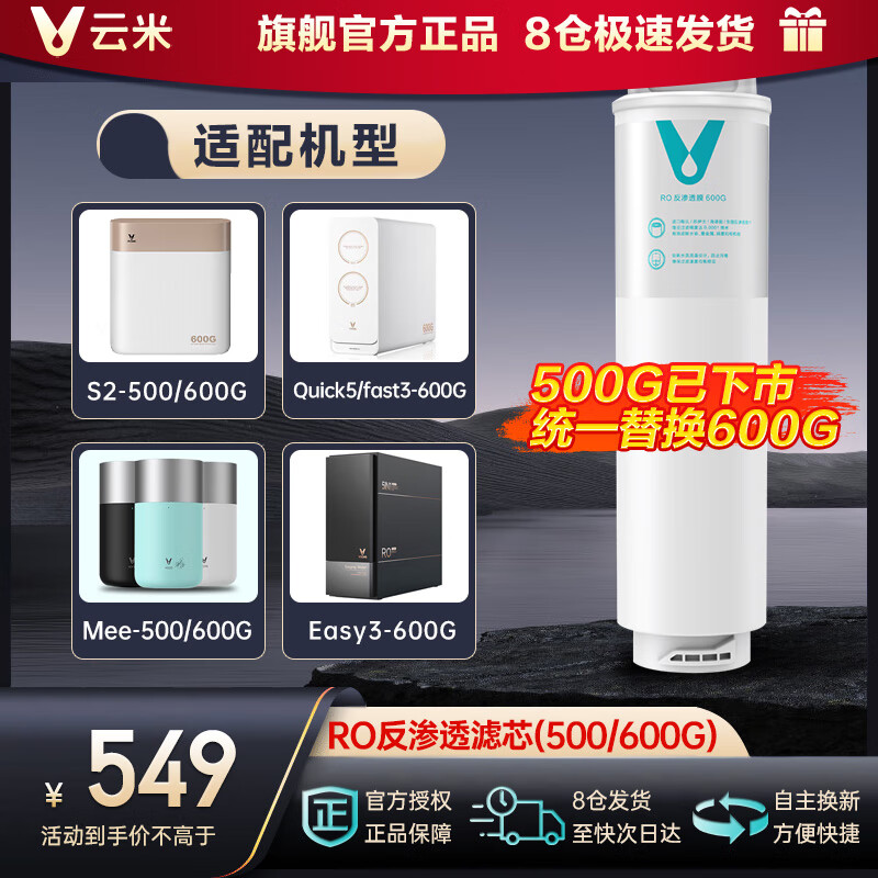 云米(VIOMI) 升级款云米净水器滤芯适配机型S2、Fast3、X2、Quick5、MeePlus、澎湃/Fast 1000G 2号RO膜(500/600G)价格:549.00元!
