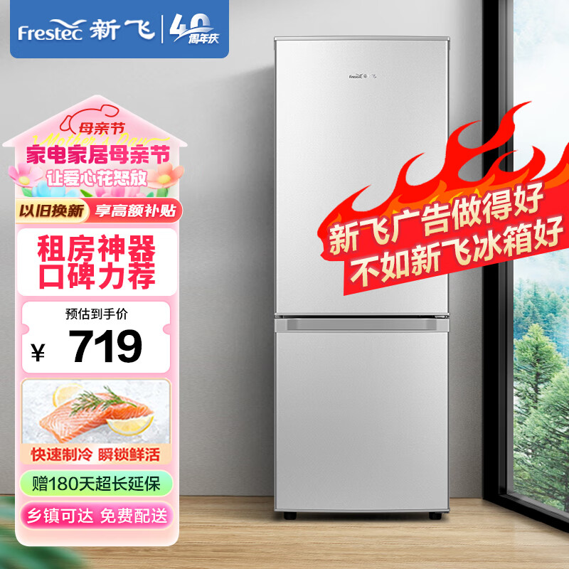 新飞(Frestec)160升两门冰箱双门小冰箱环保内胆家用小型双门冰箱宿舍租房小巧不占地方BCD-160K2AT价格:719.00元!