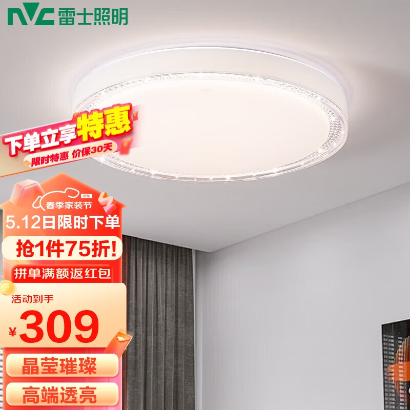 雷士(NVC)LED吸顶灯 轻奢高端卧室书房餐厅灯具 绚丽光效透光圆形灯饰价格:412.00元!