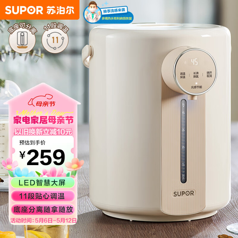 苏泊尔(SUPOR)电热水瓶 除氯电热水壶烧水壶 5L大容量304不锈钢电水瓶 多段保温恒温电水壶 SW-50T109价格:259.00元!