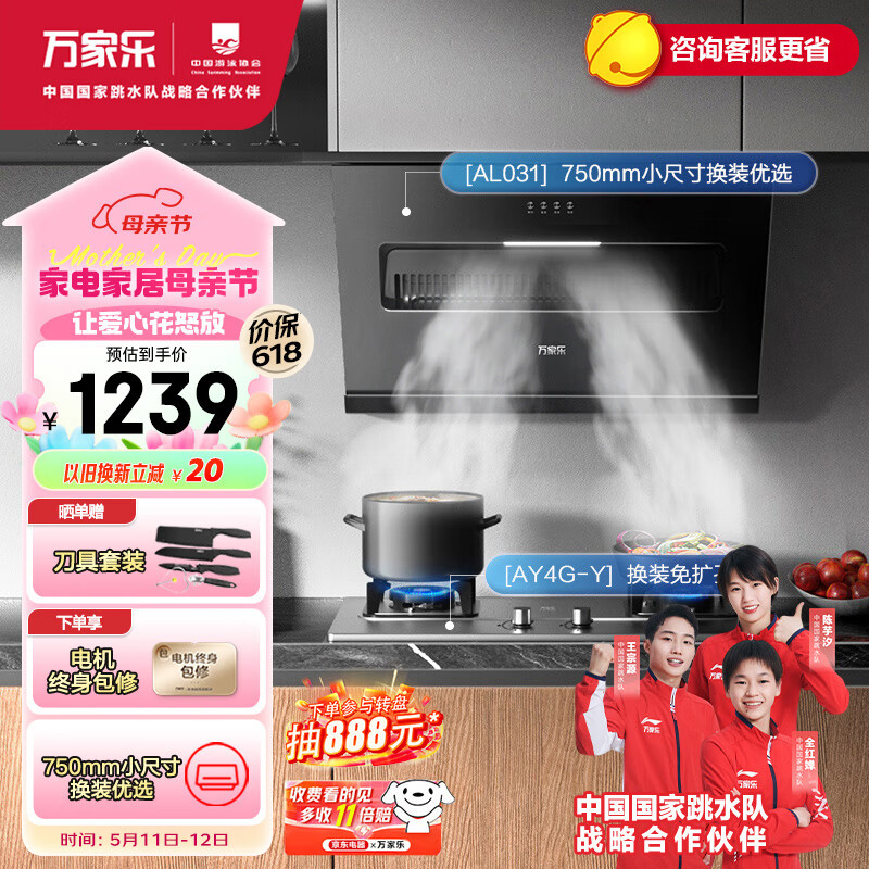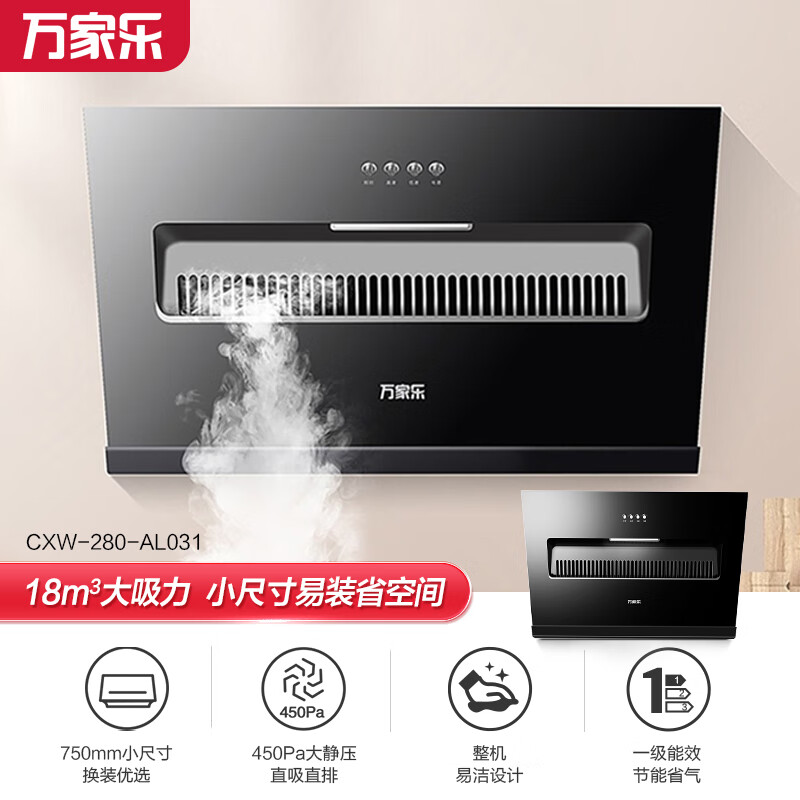 万家乐抽油烟机 18立方小尺大吸力油烟机?家用换新免扩孔4.5kw不锈钢煤气灶具套装AL031+AY4G液化气价格:1539.00元!