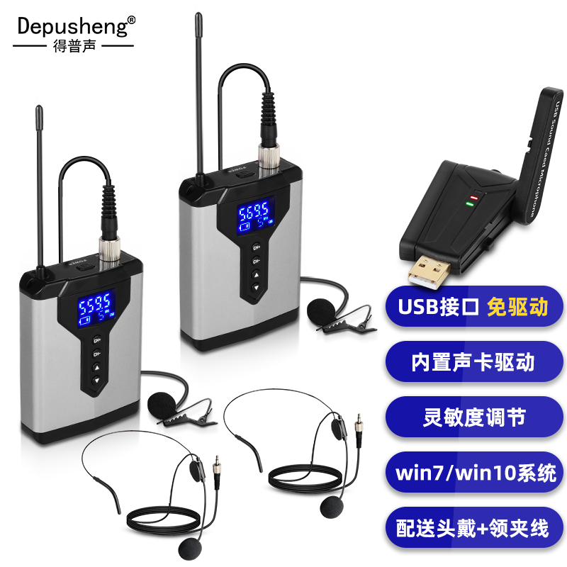 depusheng W4 USB无线麦克风领夹话筒电脑笔记本直播视频会议网课录音K歌降噪收音调频混响 QU6 USB无线领夹话筒(配头戴线)一拖二价格:299.00元!