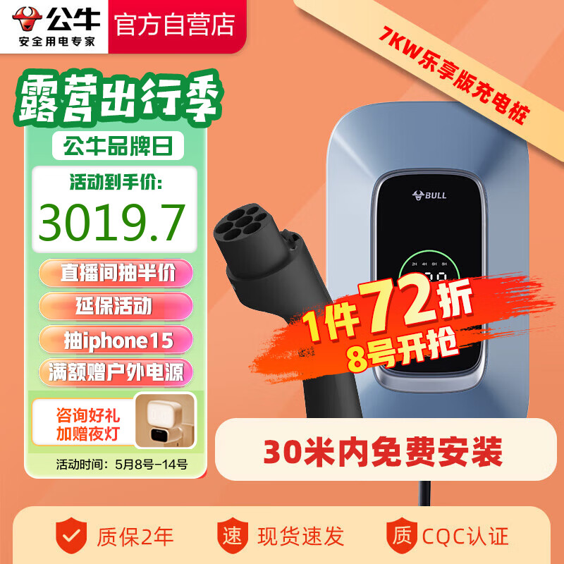 公牛(BULL)新能源汽车交流充电桩适配于小米su7汽车特斯拉比亚迪极氪问界小鹏理想蔚来等 7KW乐享款 30米安装价格:4194.00元!