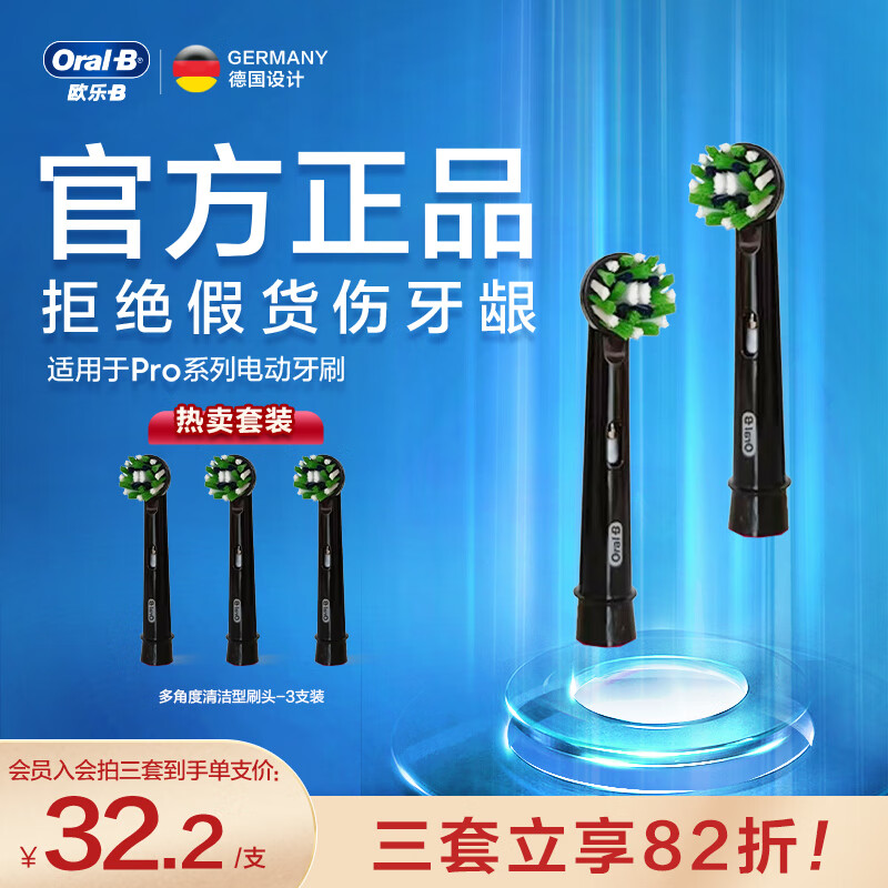 欧乐B电动牙刷头 成人多角度清洁型3支装黑色 EB50BK-3 适配成人D/P/Pro系列圆头牙刷 标准型软毛 盒装价格:119.00元!
