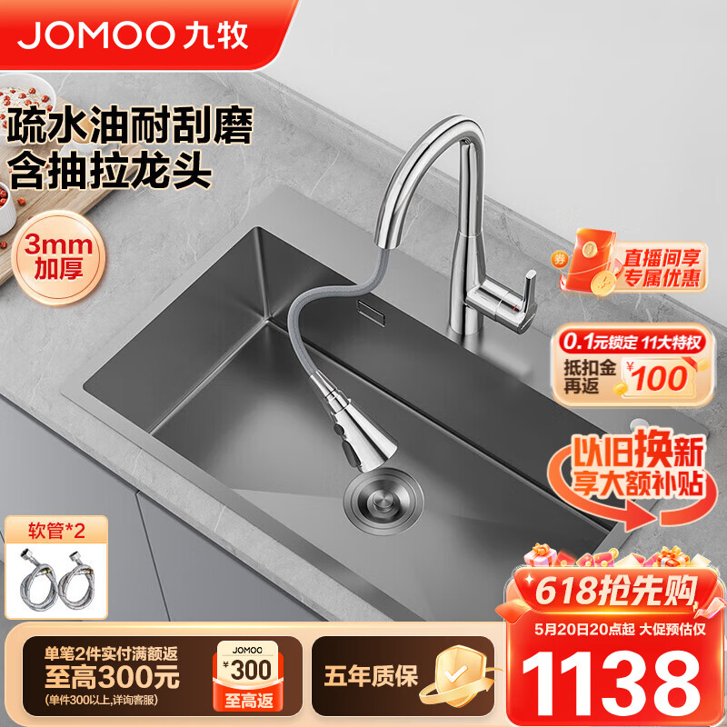 九牧(JOMOO)不锈钢手工水槽大单槽厨房洗菜盆单槽洗碗池70*45(含龙头)02264价格:1510.00元!