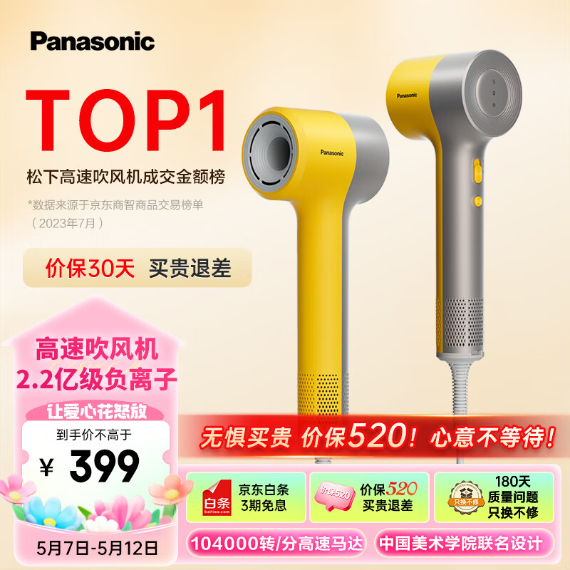 松下(Panasonic)缤纷筒高速吹风机负离子低噪音大风力家用新年礼物电吹风速干护发家用大功率吹风筒NE7毕加索黄价格:429.00元!