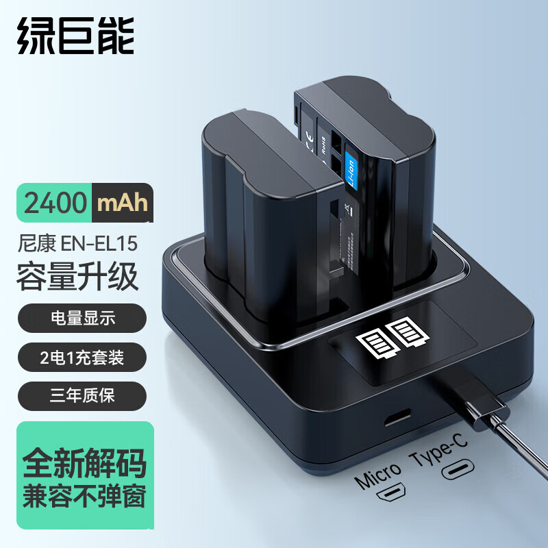 绿巨能(llano)尼康电池EN-EL15C相机电池d810充电器d7100/D7500/D750/D850等数码相机电池 两电双充套装2400mAh价格:329.00元!