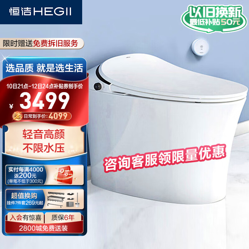 恒洁(HEGII)智能马桶一体机Qs2 适用低水压即热坐便器HCE827A01(坑距400mm)价格:4409.00元!