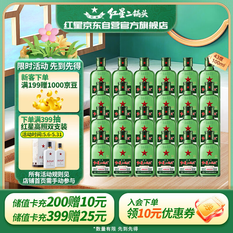 红星二锅头小二 清香型白酒 43度 100ml*24瓶 整箱装 口粮酒价格:199.00元!