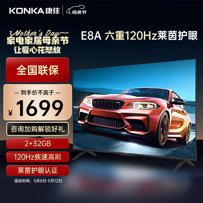 康佳电视 55E8A 55英寸 2+32GB 120Hz高刷护眼电视 4K超清屏投屏 智能语音液晶平板电视机以旧换新价格:1598.00元!