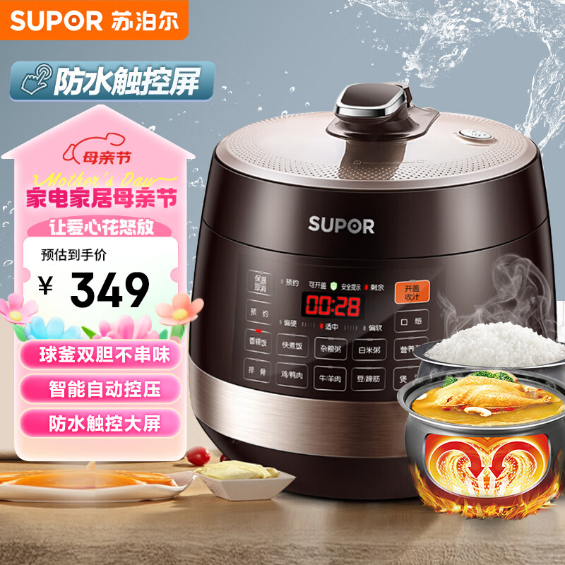 苏泊尔(SUPOR)全自动智能预约电锅5L 触控面板家用煲汤保温易清洁双球釜内胆SY-50YC9001Q电饭煲高压锅3-6人价格:339.00元!