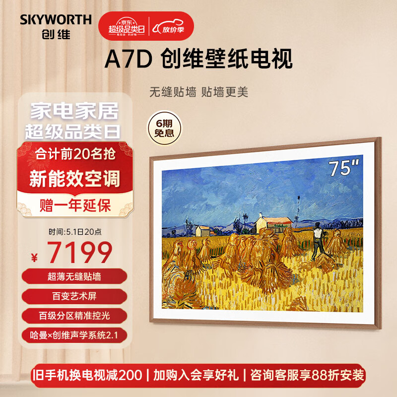 创维壁纸电视75A7D 75英寸超薄壁画艺术电视机 无缝贴墙百变艺术屏 4K超高清护眼液晶电视价格:7199.00元!