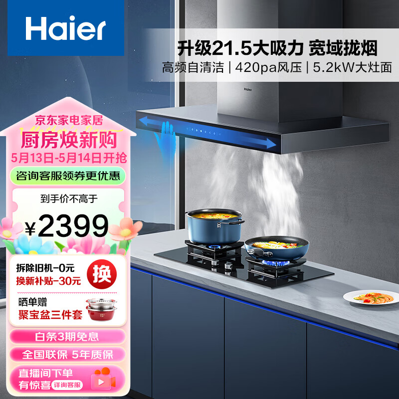 海尔(Haier)抽油烟机 顶吸式吸排烟机 升级21.5m3/min大吸力 自清洁挥手智控 家用脱排油烟机T11+Q7BE3天价格:2399.00元!