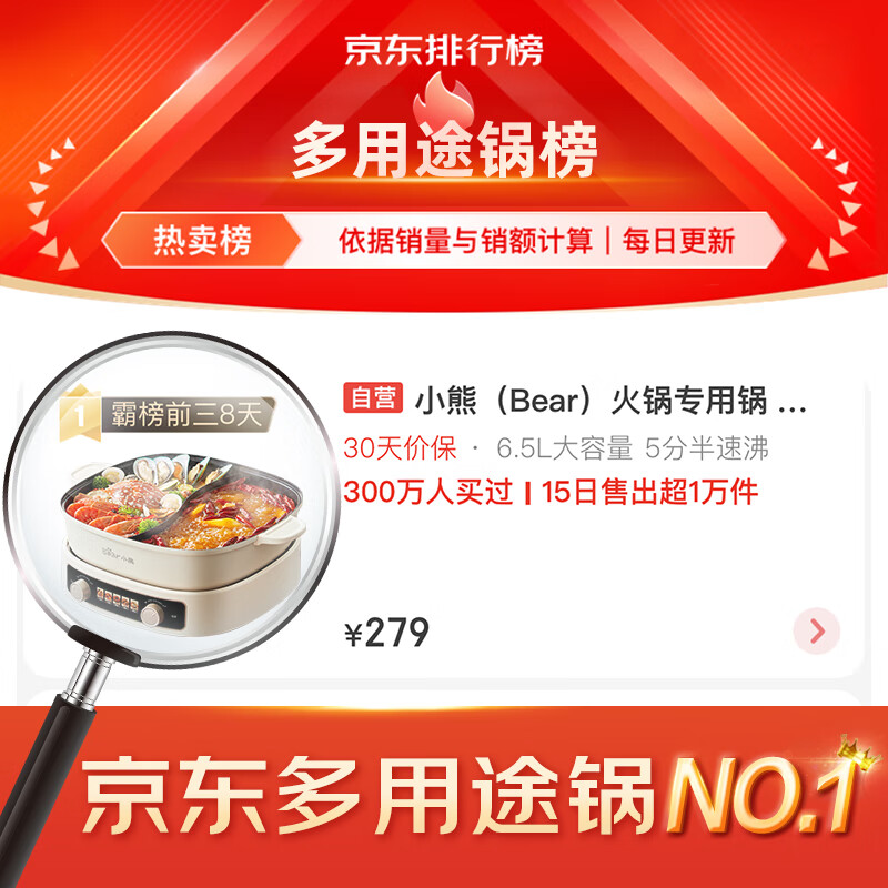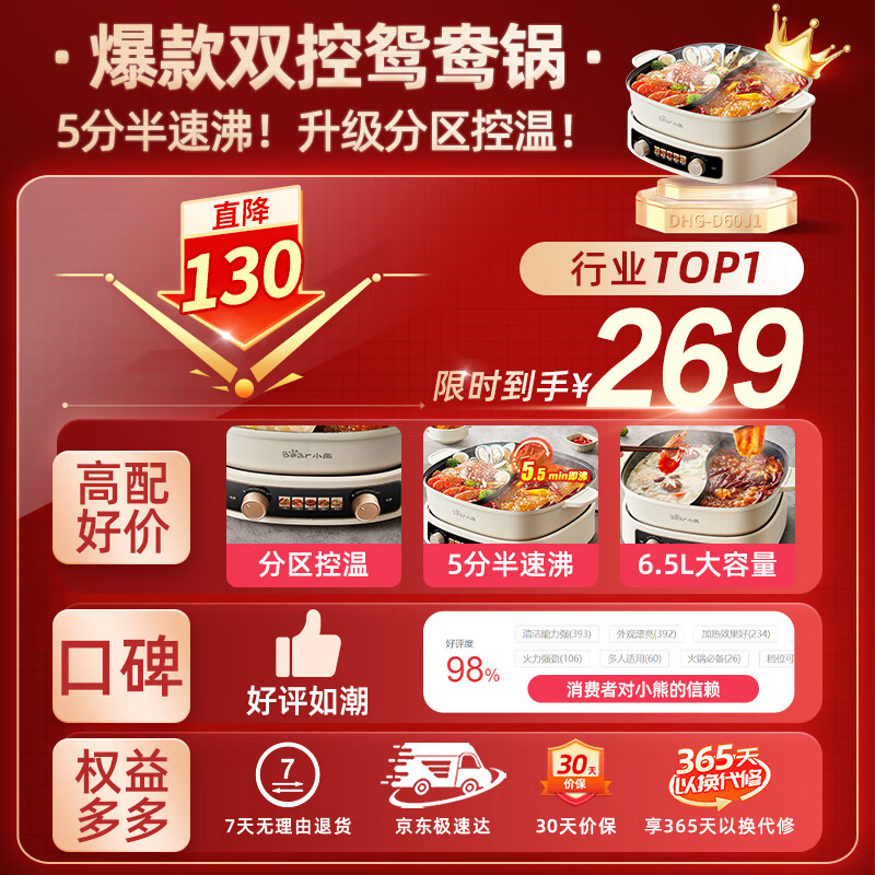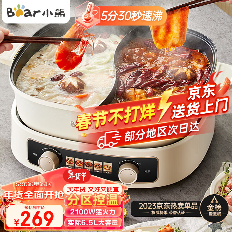 小熊(Bear)火锅专用锅 鸳鸯锅电火锅 5分半速沸 家用分体多功能电煮锅火锅锅具分区控温DHG-D60J1 6.5L大容量价格:269.00元!