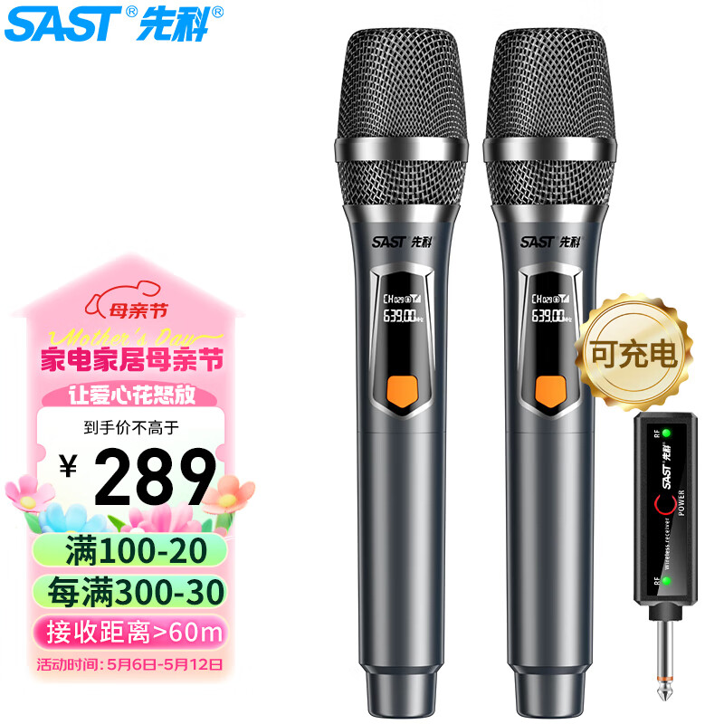 先科(SAST)ok-184 手持充电无线麦克风U段家庭KTV唱歌舞台主持演讲K歌会议音箱功放调频一拖二金属话筒价格:309.00元!