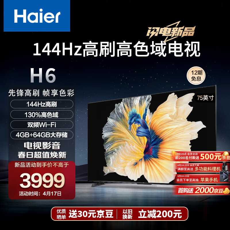 海尔(Haier)75H6 75英寸电视 4K超高清 144Hz屏 4+64GB 超薄游戏电视智能液晶平板电视机以旧换新价格:3999.00元!