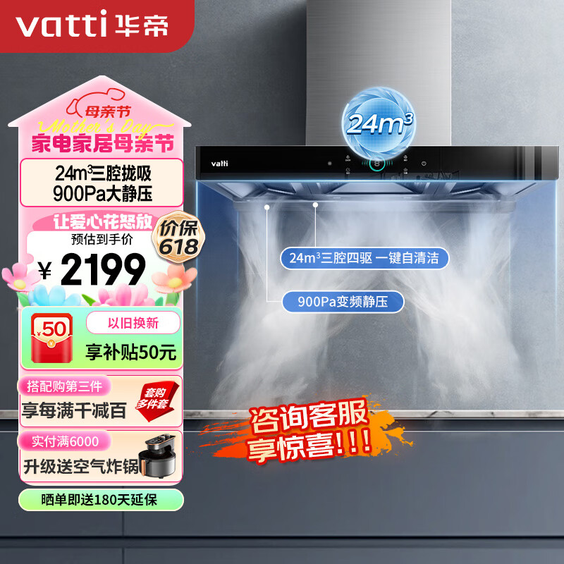 华帝(VATTI)抽油烟机顶吸三腔三吸变频创世S6欧式家用吸油烟机 24风量大吸力低噪挥手智控一键自清洁 i11206价格:2199.00元!