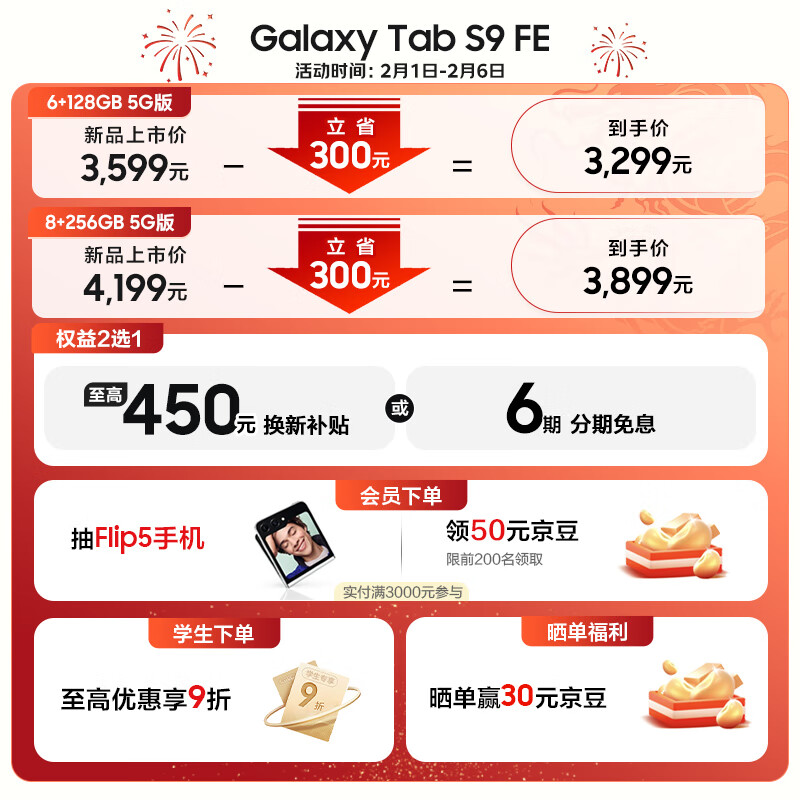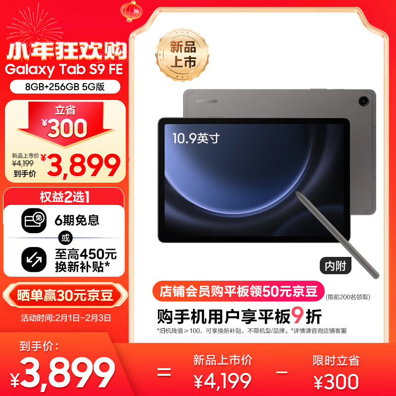 三星(SAMSUNG)S9 FE 2023款Tab 10.9英寸 Exynos1380 IP68防水防尘含Spen 90Hz 8G+256GB 5G 石墨灰价格:3899.00元!