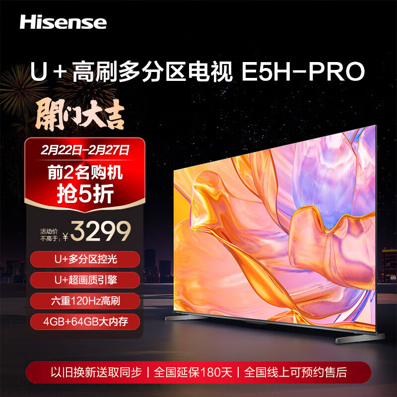 海信电视 65E5H-PRO 65英寸 多分区控光 六重120Hz高刷 4K高清 杜比全景声 液晶智能平板电视机价格:4299.00元!
