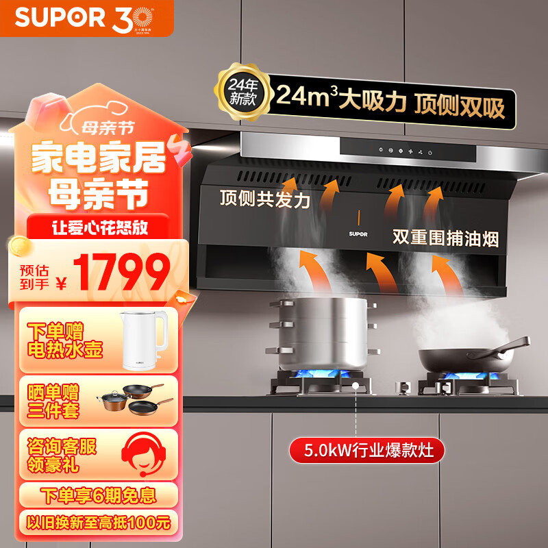 苏泊尔(SUPOR)抽油烟机 顶侧双吸7字型烟灶套装24立方挥手免拆洗家用烟机燃气灶具套装DL11+Q5天价格:1869.00元!