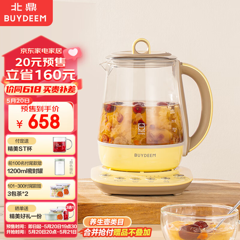 北鼎(Buydeem)养生壶中药壶多功能养生壶迷你玻璃煮茶器 煮茶壶花茶壶黑茶燕窝银耳K118小鹅黄价格:658.00元!