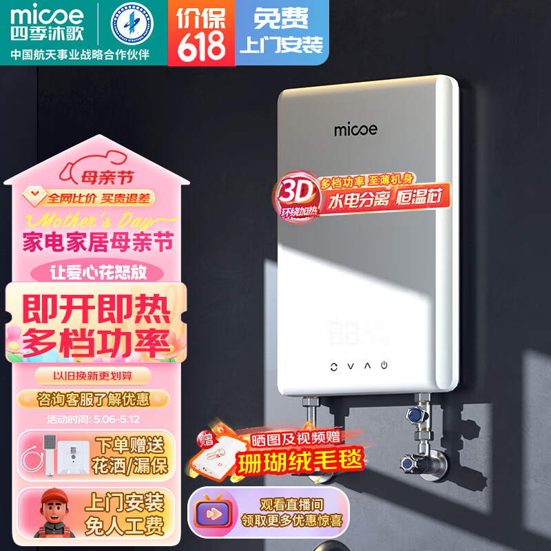 四季沐歌(MICOE)电热水器即热式 家用洗澡淋浴恒温免储水扁桶超薄过水热变频智能机 上门安装 DSK-H70-MS01【7000W变频】价格:586.00元!