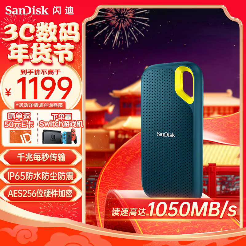 闪迪(SanDisk)2TB Nvme移动固态硬盘(PSSD)E61极速版松柏青SSD 读速1050MB/s 手机笔记本外接价格:1199.00元!