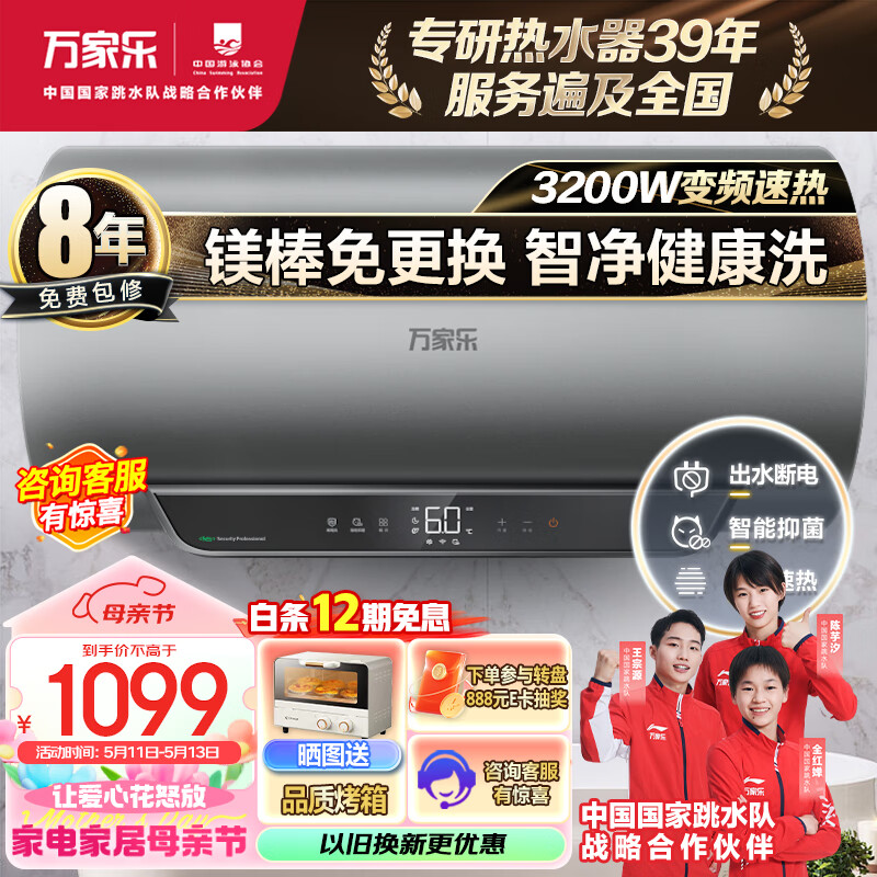万家乐电热水器60升 储水式一级能效3200W速热 镁棒免换出水自动断电智能灭菌D60-FW5价格:1299.00元!