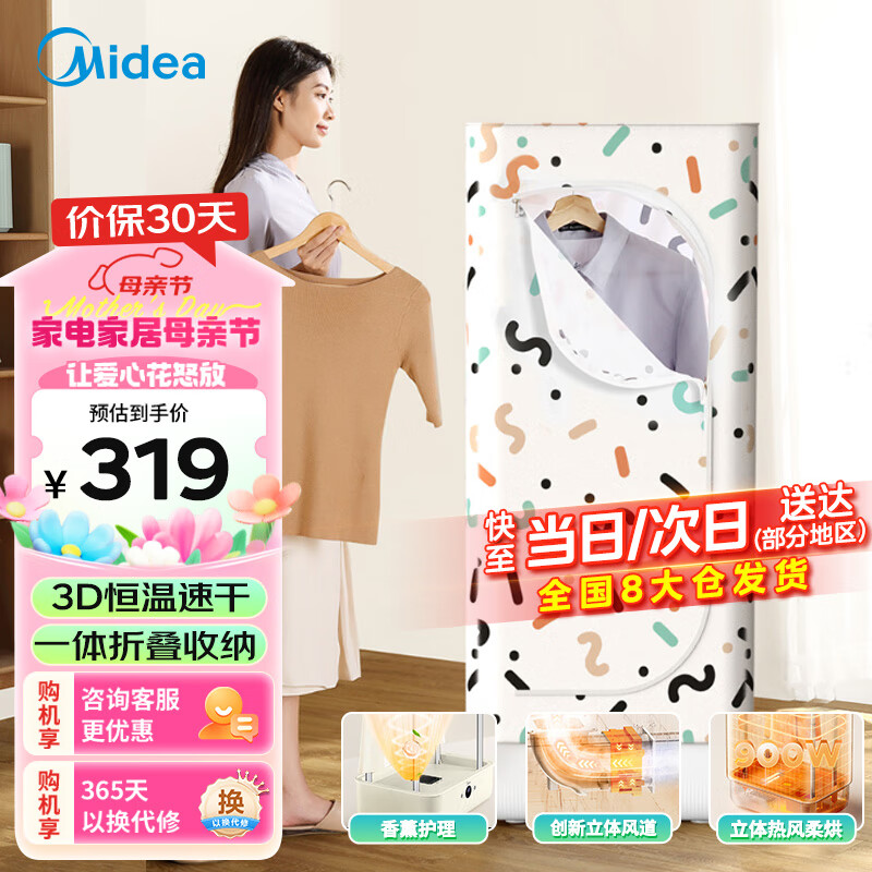 美的(Midea)干衣机 烘干机家用小型 智能恒温速干 香薰除臭祛味 折叠烘鞋器烘衣机 衣物护理机 MHJ70-02L价格:319.00元!