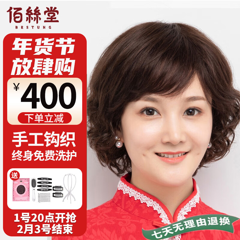 佰丝堂假发女短发全手织中老年妈妈短卷发全头套式整顶假发全真发深棕色价格:2280.00元!