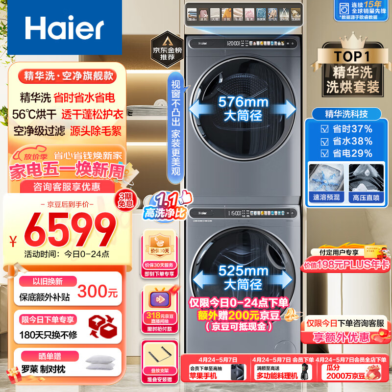 海尔(Haier)精华洗洗烘套装 10KG超薄大筒径滚筒洗衣机+热泵烘干机家用 晶彩触控屏 烘被除潮湿 MATESL59S+59价格:7299.00元!