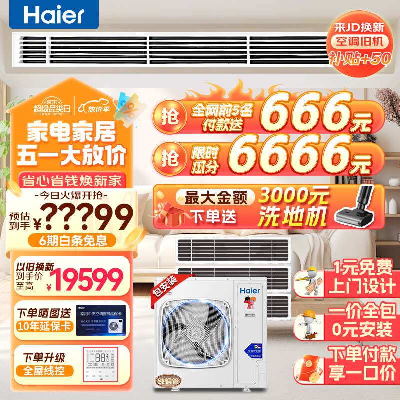 海尔(Haier)中央空调一拖三风管机5匹小多联一级能效全直流变频嵌入式智尊+ RFC125MXSAVB(F)价格:19999.00元!