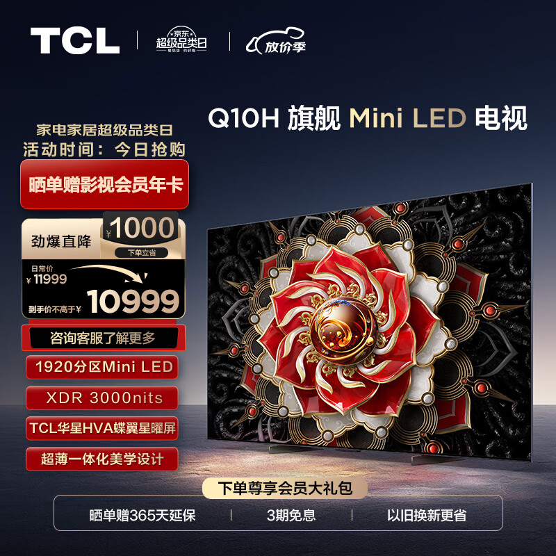 TCL电视 75Q10H 75英寸 Mini LED 1920分区 XDR 3000nits 超薄 4K大屏 液晶智能平板电视机价格:10999.00元!