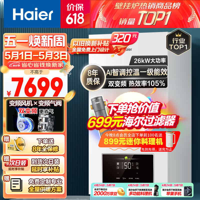 海尔(Haier)双变频一级能效冷凝燃气壁挂炉天然气采暖炉热水器板换式地暖暖气片五点恒温LL1PBD26-JN7(T)U1价格:7699.00元!