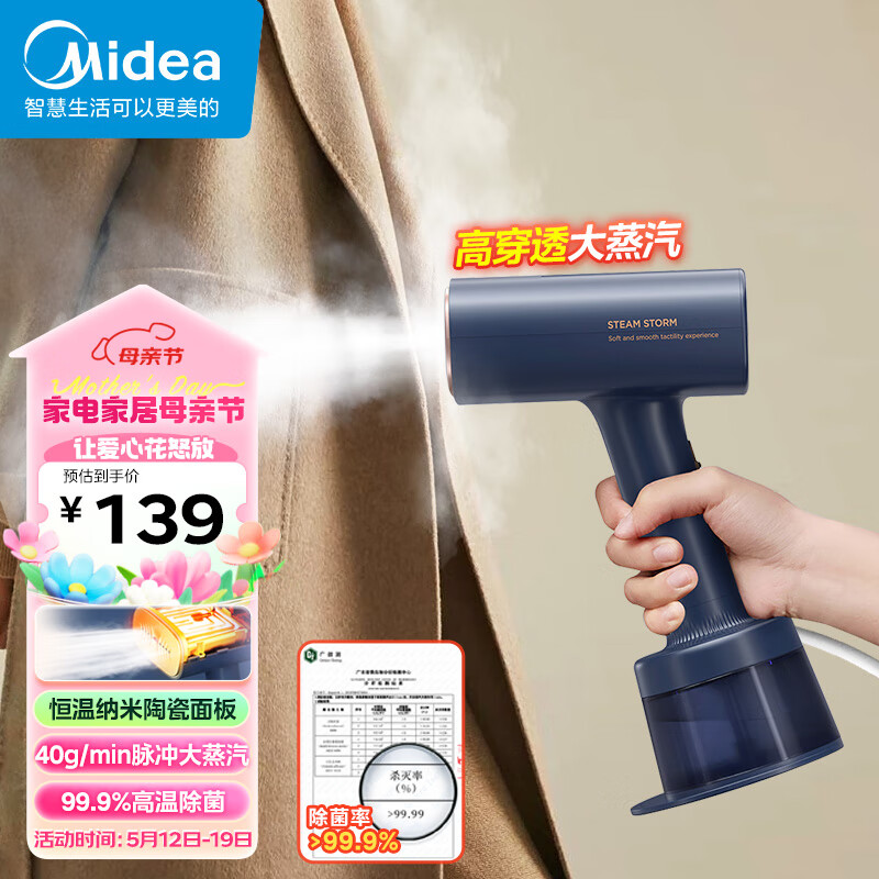 美的(Midea)【暴风蒸汽】手持挂烫机家用电熨斗熨烫机大蒸汽电熨斗旅行出差便携式小型熨烫机团购礼品YBJ21T1价格:169.00元!