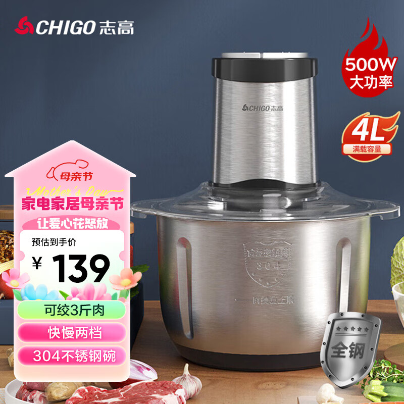 志高(CHIGO)绞肉机家用商用4L多功能辅食机电动料理机全不锈钢切肉机大功率碎肉馅机多功能绞馅机 PY-5925价格:139.00元!